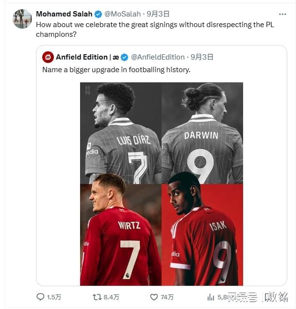 新赛季开始了。有个社交账号在讨论迪亚兹、努涅斯离队,维尔茨、伊萨克加盟,利物浦的新老交替。萨拉赫在那条社媒后面评论,“我们忘记了夺冠功勋,去欢呼新援,这不太合适吧”?