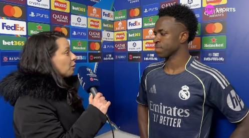 欧冠1/8决赛次回合,皇马客场2-1战胜曼城,维尼修斯赛后接受了TNT体育巴西频道的采访。